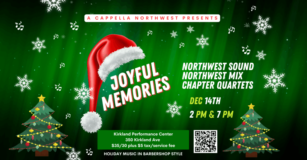 Take a joyful musical stroll down memory lane. Join A Cappella Northwest for an evening of the very best a cappella available on the Eastside as they present Northwest Sound and Northwest Mix in their celebration of the season, Joyful Memories! This joint performance, inspired by family traditions, will include Christmas music from the past 40 years of Barbershop shows, ranging from well-known traditional Christmas standards to innovative arrangements of old songs, as well as joyful new music. These award-winning choruses, with additional performances by a cappella quartets, guarantee an amazing and entertaining experience for the entire family. If you enjoy the simple pleasure of hearing hearts raised in song, make a point of seeing this show.